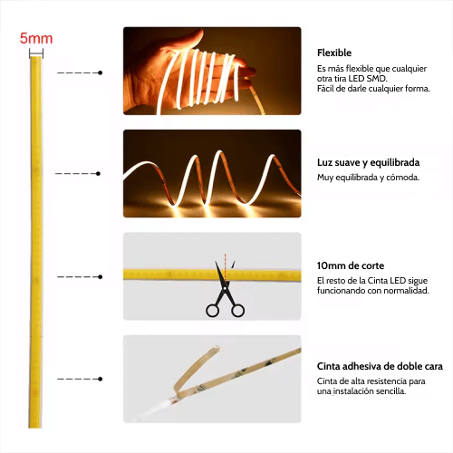 Cinta LED COB Ultradelgada 12V 5mm de ancho 5m Corte 10mm