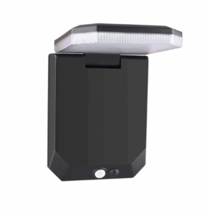 Reflector LED solar autónomo de 800 lúmenes con sensor de movimiento, fotocelda y diseño que simula una cámara. IP65 resistente al agua, con panel solar integrado y cuerpo ajustable 360°.
